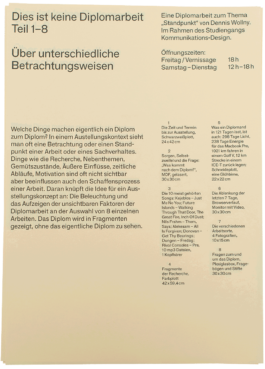 What things actually make a diploma to a diploma? In an exhibition context one often sees a fixed perspective or a single point of a work or an issue. Things like research, secondary themes, moods, external influences, timing or motivation are often not visible, but also influence the creative process. This is followed by the idea for an exhibition concept: The highlighting and demonstration of the invisible factors of the diploma at the choice of 8 individual works. The diploma is shown in fragments, without showing the actual “whole thing”.